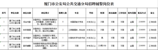 (一)招聘崗位。具體招聘崗位詳見《廈門市公安局公共交通分局招聘輔警崗位表》。
