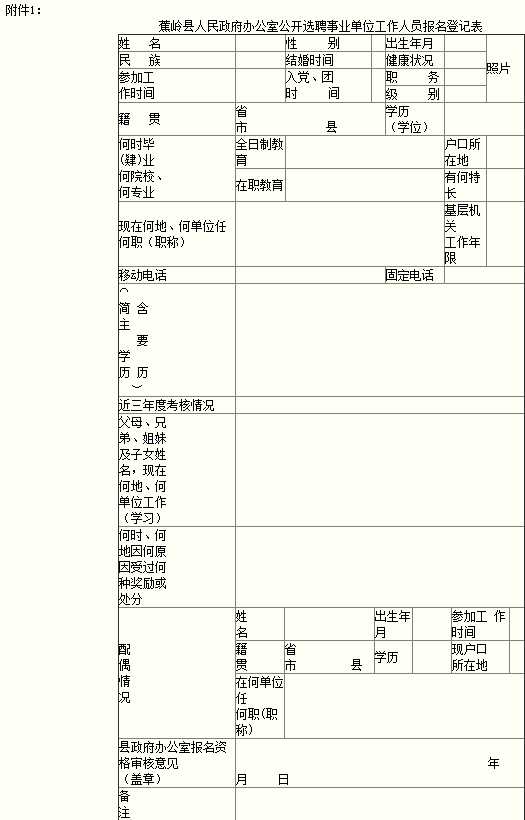 (1)粘貼有報名人員近期二寸正面免冠照片的《蕉嶺縣人民政府辦公室公開選聘事業單位工作人員報名登記表》一式兩份(該表格需雙面打印,見附件1)。
