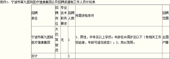 寧波市第九醫院醫療健康集團因發展需要,根據有關規定,擬向社會公開招聘派遣制工作人員1名。現就有關事項公告如下: