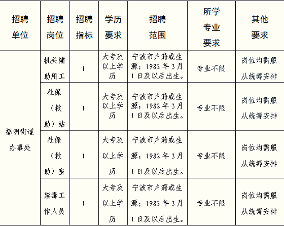 因工作需要,寧波市鄞州區(qū)福明街道擬面向社會招聘編外工作人員4名。具體要求如下: