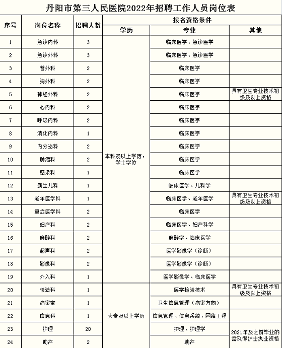 7、招聘崗位、人數和所要求的學歷、專業等資格條件詳見《丹陽市第三人民醫院2022年招聘工作人員崗位表》。