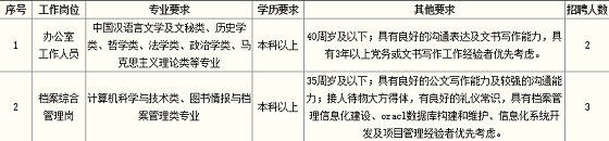 柳州市不動產檔案管理中心是柳州市自然資源和規劃局下屬的具有獨立事業法人資格的全額撥款事業單位。負責全市不動產檔案的接收、管理及利用工作。現因工作需要,擬招聘控制數聘用工作人員數名,有關事項如下: