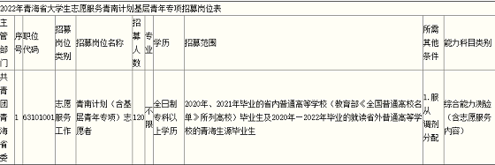 從2020年、2021年畢業的省內普通高等學校(教育部《全國普通高校名單》所列高校)畢業生及2020年—2022年畢業的就讀省外普通高等學校的青海生源畢業生中招募120人。省內2022年應屆畢業生由所在高校組織報名考試。二、招募條件和程序