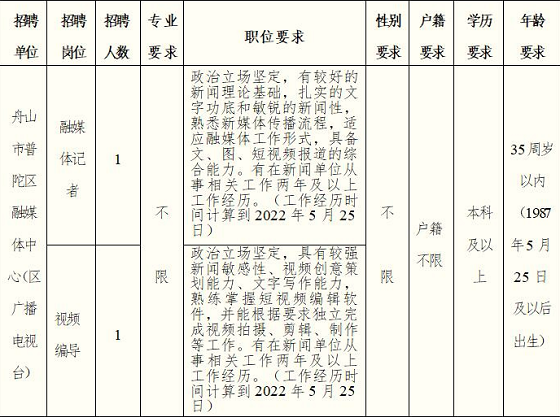 根據工作需要,經研究,舟山市普陀區融媒體中心(區廣播電視臺)決定面向社會公開招聘事業單位工作人員共2名,現將有關事項公告如下: