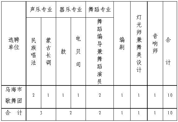 為了加快烏海文化事業的發展,進一步優化市歌舞團藝術專業隊伍結構,提高整體專業水平,現決定公開選聘10名專業人員。