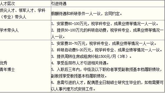 根據《岳陽市打造高質量發展人才高地的若干措施》(岳發〔2020〕6號)和《岳陽市加快省域副中心城市人才高地建設的若干措施》(岳發〔2021〕17號)規定,岳陽市市直事業單位“四海攬才”引進的急需緊缺專業人才享受以下政策待遇。縣市區事業單位人才待遇請具體咨詢招聘單位。
