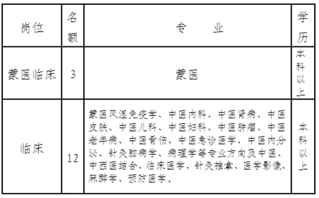 根據(jù)事業(yè)發(fā)展需要,決定2013年為市蒙中醫(yī)院公開招聘醫(yī)務人員15名。現(xiàn)公告如下: