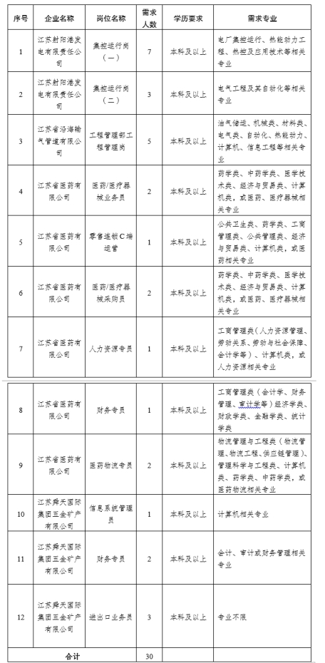 江蘇射陽港發(fā)電有限責(zé)任公司、江蘇省沿海輸氣管道有限公司招聘工作由集團統(tǒng)一組織;江蘇省醫(yī)藥有限公司、江蘇舜天國際集團五金礦產(chǎn)有限公司自行組織實施。