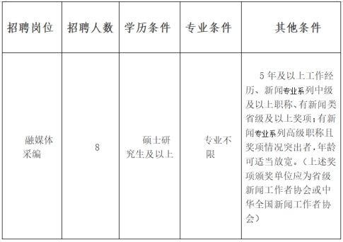4.具有碩士研究生及以上學(xué)歷,年齡在40周歲以下(1981年9月20日以后出生);有新聞專業(yè)系列高級(jí)職稱者,學(xué)歷可放寬至本科。戶籍不限。