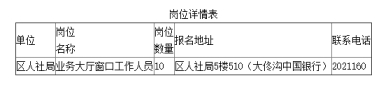 區人社局業務大廳窗口工作人員10名,業務大廳窗口工作人員負責人社局業務大廳接待辦理,在崗期限最多不超過三年。