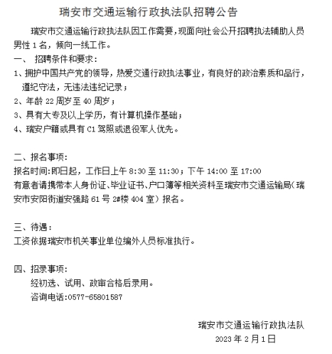 2023年浙江溫州瑞安市交通運輸行政執法隊招聘公告