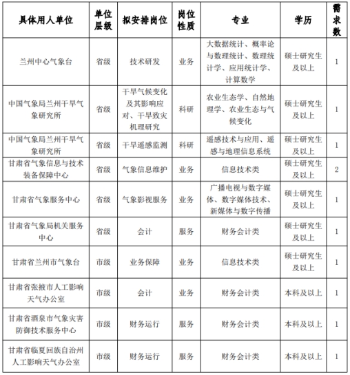 根據《氣象部門事業單位公開招聘應屆高校畢業生管理辦法》和《甘肅省氣象部門事業單位公開招聘應屆高校畢業生實施細則》的要求,為滿足甘肅省氣象局事業單位工作需要,本階段面向應屆高校畢業生公開招聘工作人員11名。現就有關事項公告如下: