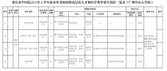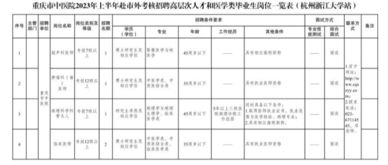 具體招聘條件及報名方式詳見《重慶市屬醫(yī)療衛(wèi)生事業(yè)單位2023年上半年赴市外考核招聘高層次醫(yī)學(xué)人才和醫(yī)學(xué)類畢業(yè)生公告》https://rlsbj.cq.gov.cn/zwxx_182/sydw/202302/t20230221_11632172.html