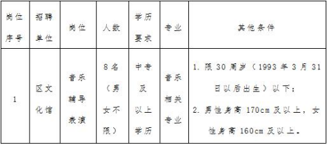 區文化館音樂輔導表演崗位,測試內容:(1)演唱一首中國聲樂作品(自備伴奏);(2)表演一段舞蹈(音樂自備,時長2分左右);(3)朗誦一段作品(作品自備,時長1分30秒左右);(4)即興問答。