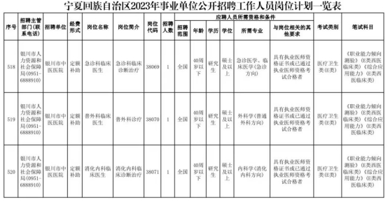 銀川市中醫(yī)醫(yī)院本次招聘3個(gè)崗位,招聘工作人員3人。招聘崗位、資格條件詳見《寧夏回族自治區(qū)2023年事業(yè)單位公開招聘工作人員崗位計(jì)劃一覽表》(序號(hào)518-520:銀川市中醫(yī)醫(yī)院)。