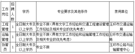 因工作需要,經(jīng)市委編辦批準(zhǔn),玉環(huán)市交通運(yùn)輸局?jǐn)M向社會公開招聘編外人員3名,現(xiàn)將有關(guān)事項(xiàng)公告如下: