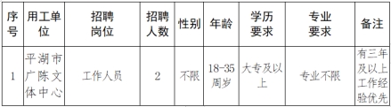 因工作需要,平湖市廣陳文體中心決定委托平湖市迪邦保潔服務有限公司,面向社會公開招聘勞務派遣制工作人員,具體事項如下: