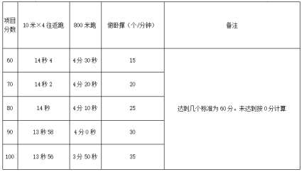 (一)體能測(cè)試。時(shí)間地點(diǎn)另行通知。體能測(cè)評(píng)的標(biāo)準(zhǔn),按照如下標(biāo)準(zhǔn)執(zhí)行。