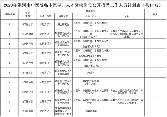 根據(jù)《2023年漯河市市直醫(yī)療衛(wèi)生事業(yè)單位公開招聘工作人員簡章》,漯河市中醫(yī)院面向社會公開招聘工作人員36名。