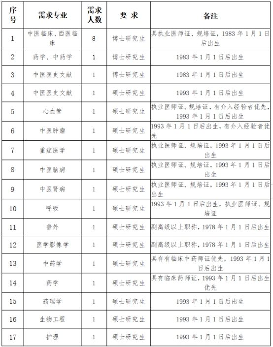 招聘專業(yè)技術(shù)崗位人員博士研究生10人,碩士研究生學(xué)歷14人。詳見附表1《河南省中西醫(yī)結(jié)合醫(yī)院2023年公開招聘人員一覽表》。