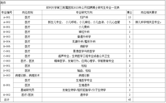 (七)崗位所需的專業和其他條件詳見《2023年鄭州大學第三附屬醫院河南省婦幼保健院公開招聘博士研究生專業一覽表》(附件);