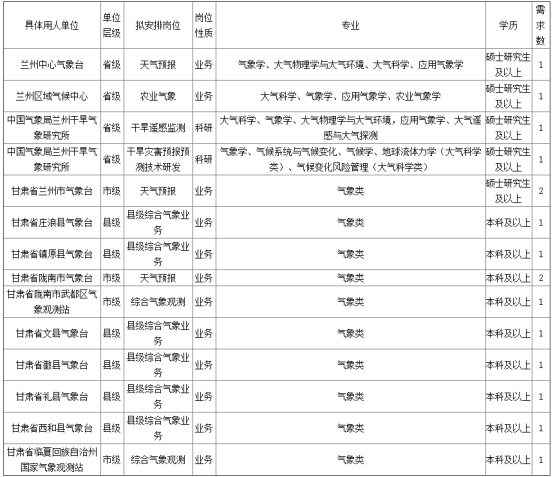 根據《氣象部門事業單位公開招聘應屆高校畢業生管理辦法》和《甘肅省氣象部門事業單位公開招聘應屆高校畢業生實施細則》的要求,為滿足甘肅省氣象局事業單位工作需要,本階段面向氣象類專業應屆高校畢業生公開招聘工作人員16名。現就有關事項公告如下: