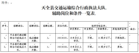 具體招聘報考資格條件詳見《天全縣公開招聘天全縣交通運輸綜合行政執(zhí)法大隊輔助崗位和條件一覽表》