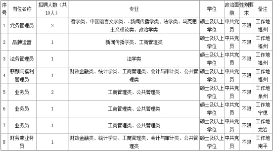福建省體育彩票管理中心(以下簡稱“省體彩中心”)是福建省體育局直屬自收自支事業單位,負責組織、協調、管理本省體育彩票銷售工作,為國家籌集彩票公益金,支持社會公益事業的發展。為進一步加強中心人才隊伍建設,提升管理服務水平,擬面向社會公開招聘碩士及以上研究生工作人員(企業用工)10名。現制定具體方案如下: