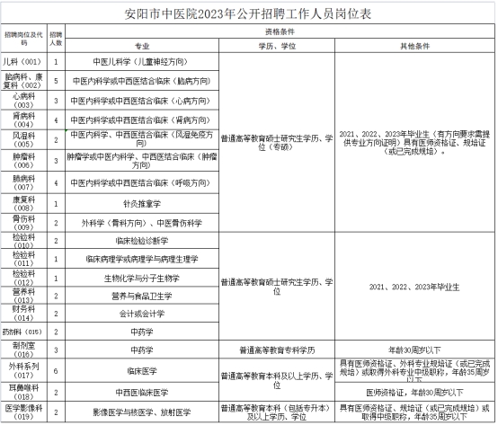 6.崗位所需要的其他條件。臨床醫(yī)療崗位須醫(yī)學(xué)院校畢業(yè)。有關(guān)具體要求詳見《安陽市中醫(yī)院2023年公開招聘工作人員崗位表》。