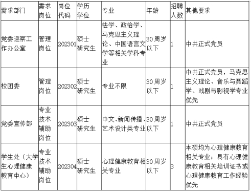 4.崗位需要的其他相關材料。報考202301,202302,202303崗位的考生須提供黨組織出具的中國共產黨正式黨員證明或中國共產黨黨員證;報考202304崗位的考生提供心理健康教育相關培訓證書,有相關工作經歷的須提供單位人事部門出具的心理健康教育工作經歷證明;現編制內人員報考時須按干部人事管理權限提供單位和主管部門同意報考的證明;