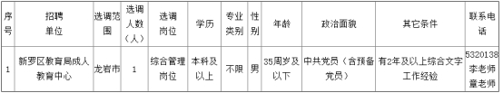 面向龍巖市范圍內行政單位(含參公)和財政全額撥款事業單位在編在崗干部,選調新羅區教育局下屬事業單位成人教育中心工作人員1名。具體要求詳見下表:
