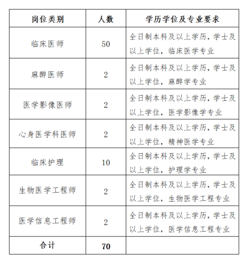 A類崗位:30名,不設具體崗位及崗位聘用人數。全日制碩士研究生及以上學歷學位(根據《教育部辦公廳等五部門關于進一步做好非全日制研究生就業工作的通知》(教研廳函〔2019〕1號)文件精神,自2017年起參加研究生國家統招,考試招生執行相同政策和標準的研究生不作全日制要求)、“雙一流”建設高校全日制本科及以上學歷學位、最新一輪學科評估為A-全日制本科及以上學歷學位。臨床醫學類、口腔醫學類、醫學技術類、護理學類、藥學類、針灸推拿學、康復治療學、生物醫學工程、醫學信息工程等醫療醫技相關專業。