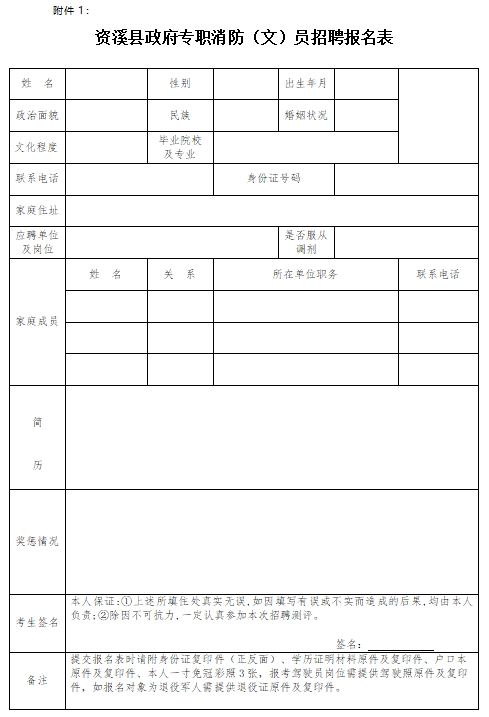 凡符合條件、有意應聘者,可將報名表(附件1)、個人簡歷、戶口簿、身份證復印件、學歷證書、榮譽證書、職業資格證書、退出消防員證、退役證等證件材料投至資溪縣消防救援大隊郵箱(1139960026@qq.com),或持本人報名表(附件1)、個人簡歷、身份證、戶口簿、學歷證書、榮譽證書、職業資格證書、退出消防員證、退役證學歷證等證件材料和近期1寸正面免冠紅底彩色照片1張到資溪縣消防救援大隊(資溪縣飛鶴大道公安消防大隊)報名。