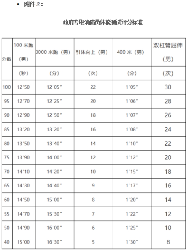 (1)體能測試:政府專職消防員考核內容為3000米、單杠引體向上、100米、400米、雙杠臂屈伸等五個項目,每個科目占比20%,按照每項得分乘20%,確定單項科目成績,總分100分.(附件2)