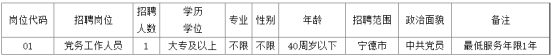 寧德市蕉城區工信局現因工作需要,擬面向社會招聘工作人員1名。現將有關事項公告如下: