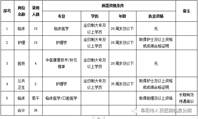 (三)阜陽市人民醫(yī)院臨泉分院(宋集中心衛(wèi)生院)有權(quán)根據(jù)崗位需求變化及報(bào)名情況等因素,調(diào)整、取消或終止個(gè)別崗位的招聘工作,并對(duì)本次招聘享有最終解釋權(quán)。