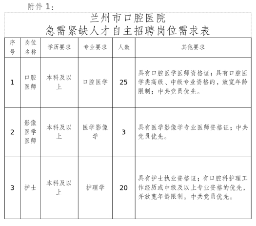 附件:1.蘭州市口腔醫(yī)院急需緊缺人才自主招聘崗位需求表