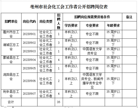 根據工作需要,亳州市總工會面向社會公開招聘一批社會化工會工作者,現將有關事項公告如下: