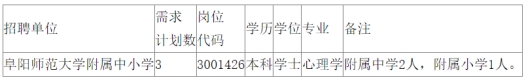 阜陽師范大學(xué)附屬中小學(xué)是經(jīng)安徽省教育廳批準(zhǔn)的公辦學(xué)校,隸屬于阜陽師范大學(xué)。因教育教學(xué)需要,根據(jù)《事業(yè)單位人事管理條例》(國務(wù)院令第652號)和《關(guān)于印發(fā)〈安徽省事業(yè)單位公開招聘人員暫行辦法〉的通知》(皖人社發(fā)〔2010〕78號)等規(guī)定,阜陽師范大學(xué)附屬中小學(xué)現(xiàn)面向教育部直屬六所師范大學(xué)2024屆公費師范畢業(yè)生公開招聘心理健康教育教師,現(xiàn)就有關(guān)事項公告如下: