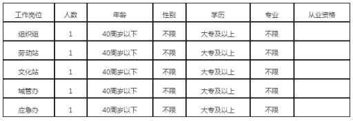 面向社會(huì)招聘編外人員5名,其中:組織組崗位1名,勞動(dòng)站崗位1名,文化站崗位1名,城管辦崗位1名,應(yīng)急辦崗位1名,條件要求如下: