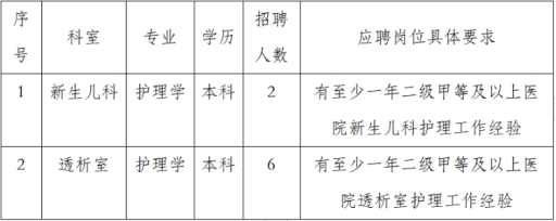 根據醫院發展需要,我院現面向社會公開招聘護理專業工作人員8名。現將有關事項公告如下: