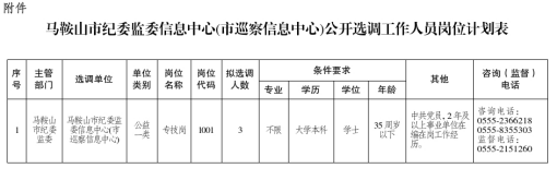 馬鞍山市紀委監委信息中心(市巡察信息中心)公開選調事業單位工作人員3名,具體崗位及選調資格條件見《馬鞍山市紀委監委信息中心(市巡察信息中心)公開選調工作人員崗位計劃表》(見附件)。