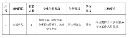 因工作需要,經嘉興市人力資源和社會保障局備案,嘉興市中心血站決定面向社會公開招聘高層次人才(博士研究生)1名。現將有關事項公告如下: