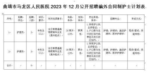 2023年及以前畢業(yè)的全日制普通醫(yī)學(xué)院校專科及以上學(xué)歷(普通高中起點(diǎn))且符合崗位招聘條件的人員(詳見《曲靖市馬龍區(qū)人民醫(yī)院2023年12月公開招聘編外合同制護(hù)士計(jì)劃表》),以下簡稱《招聘計(jì)劃表》。