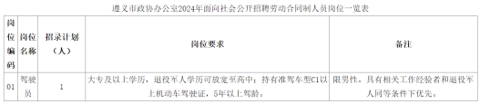 本次共計(jì)劃招聘勞動合同制人員1名,具體工作崗位及條件見《遵義市政協(xié)辦公室2024年面向社會公開招聘勞動合同制人員崗位一覽表》(附件1)。