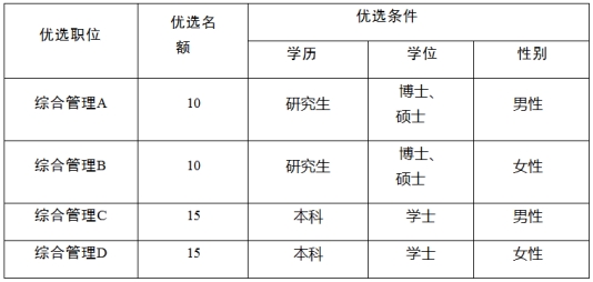 優(yōu)選職位分為四類,其中綜合管理A、綜合管理B兩類職位面向全國普通高校2024屆全日制博士研究生、碩士研究生,以及全球排名前200名高校畢業(yè)的博士、碩士;綜合管理C、綜合管理D兩類職位面向第二輪“雙一流”建設(shè)高校2024屆全日制本科生,以及全球排名前200名高校畢業(yè)的本科生。根據(jù)教研廳函〔2019〕1號(hào)文件規(guī)定,自2017年起,由國家統(tǒng)一下達(dá)招生計(jì)劃、考試招生執(zhí)行相同政策和標(biāo)準(zhǔn)的非全日制研究生可報(bào)考符合條件的相應(yīng)崗位。
