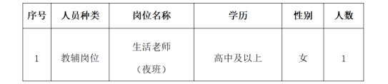 因?qū)W校實際用人需求,現(xiàn)招聘生活老師1名(女、夜班)。