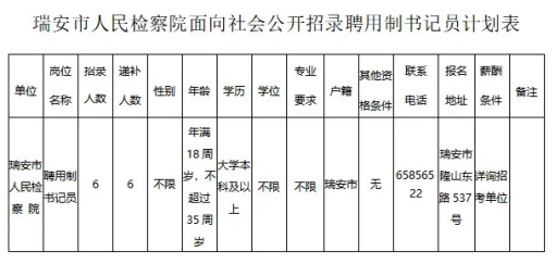 根據(jù)省委組織部、省編辦、省財政廳、省人社廳、省檢察院共同下發(fā)的《關(guān)于全省檢察機關(guān)司法雇員隊伍建設(shè)的意見》以及《浙江省檢察機關(guān)司法雇員招錄辦法(試行)》《浙江省檢察機關(guān)司法雇員管理辦法(試行)》,經(jīng)上級有關(guān)部門同意,現(xiàn)將2024年瑞安市人民檢察院面向社會公開招錄聘用制書記員有關(guān)事項公告如下: