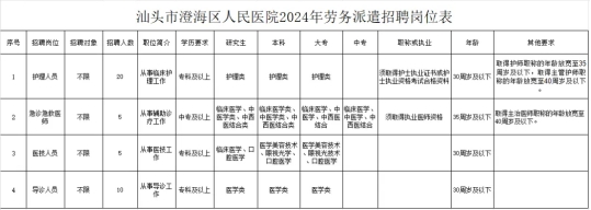 根據用人單位的工作需要,廣州粵才人力資源有限公司決定面向社會公開招聘勞務派遣工作人員,派往澄海區人民醫院從事醫療輔助相關工作,期限一年,現將有關事項公告如下: