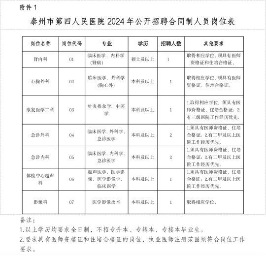 本次面向社會公開招聘合同制人員9名,各招聘崗位、人數(shù)和相關(guān)要求詳見《泰州市第四人民醫(yī)院2024年公開招聘合同制人員崗位表》(附件1,以下簡稱《崗位表》)。